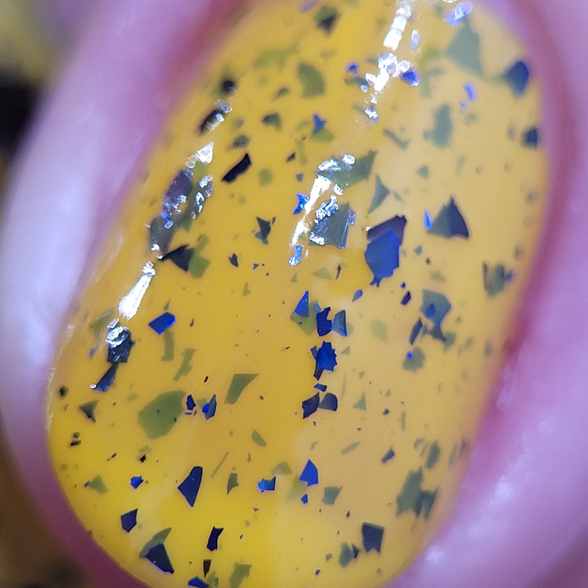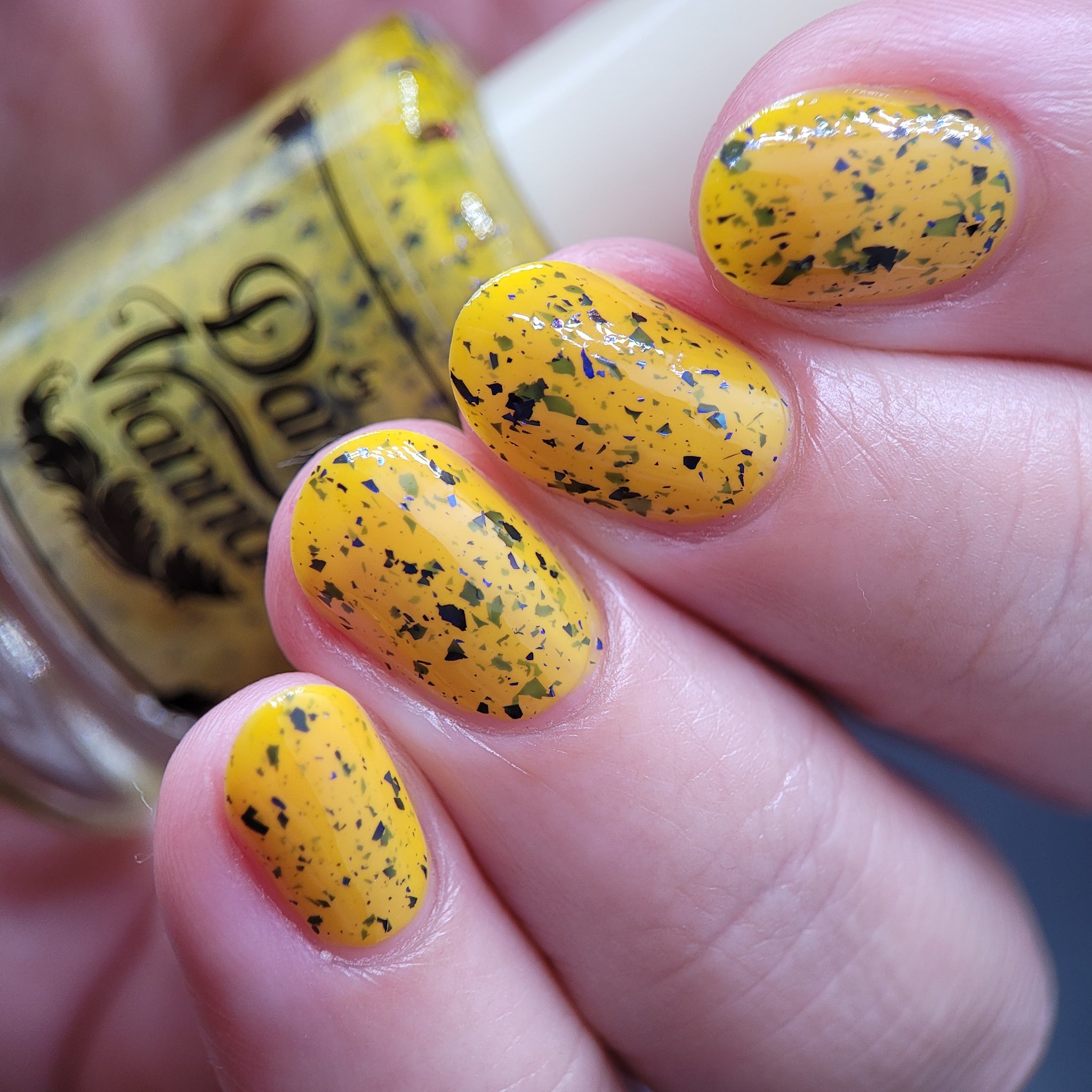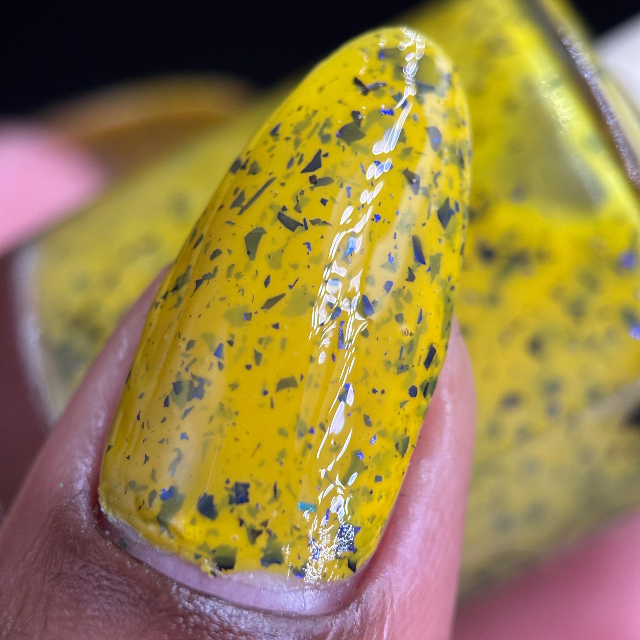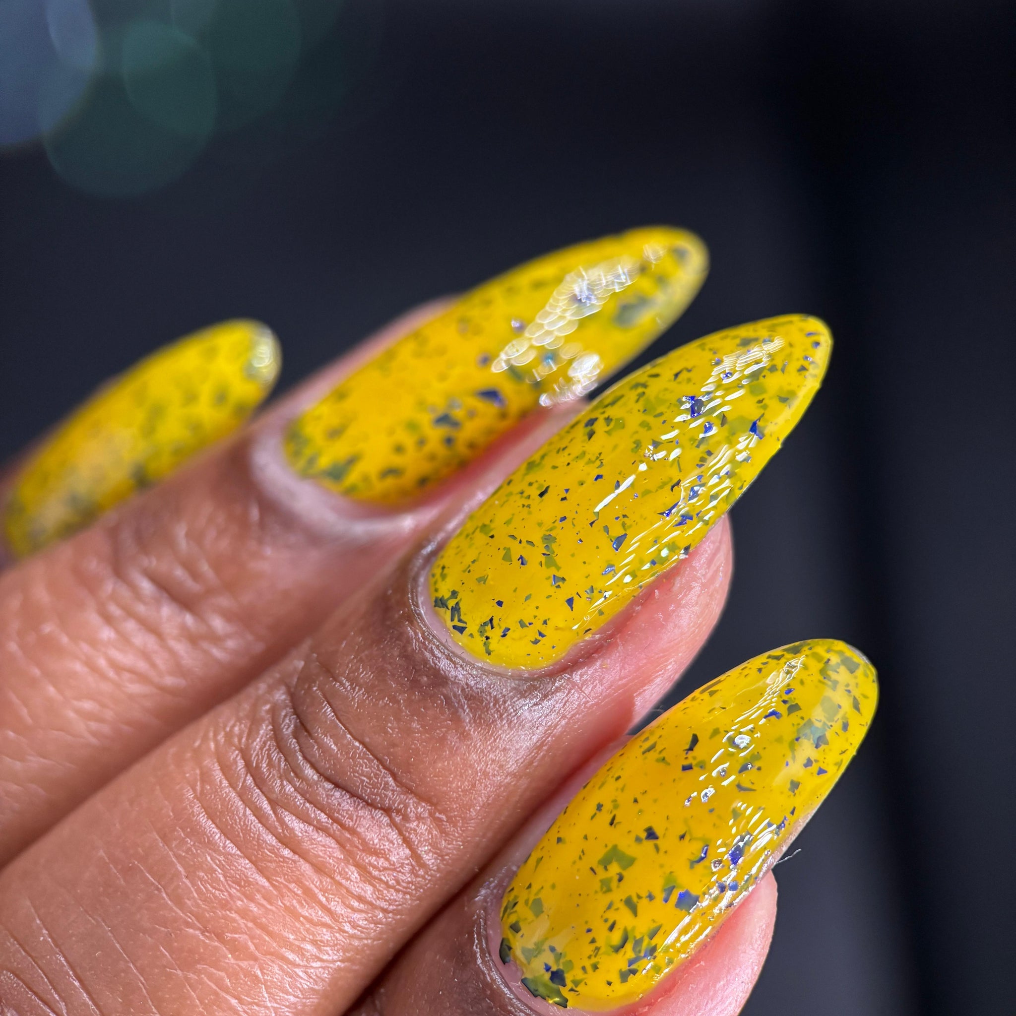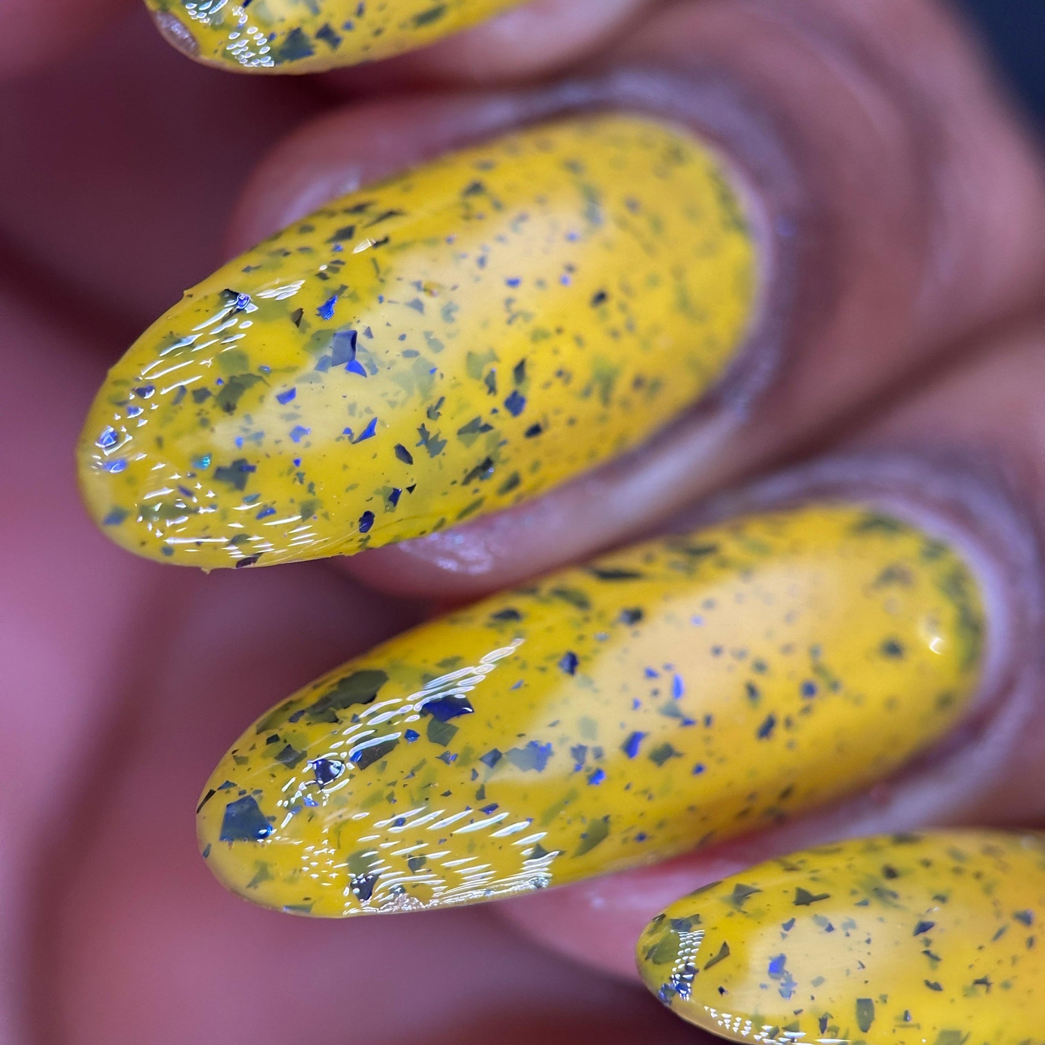 Vincent takes the Gardens has a bright yellow crelly base with a mix of indigo-purple metallic flakes and blue to black UCC flakes.