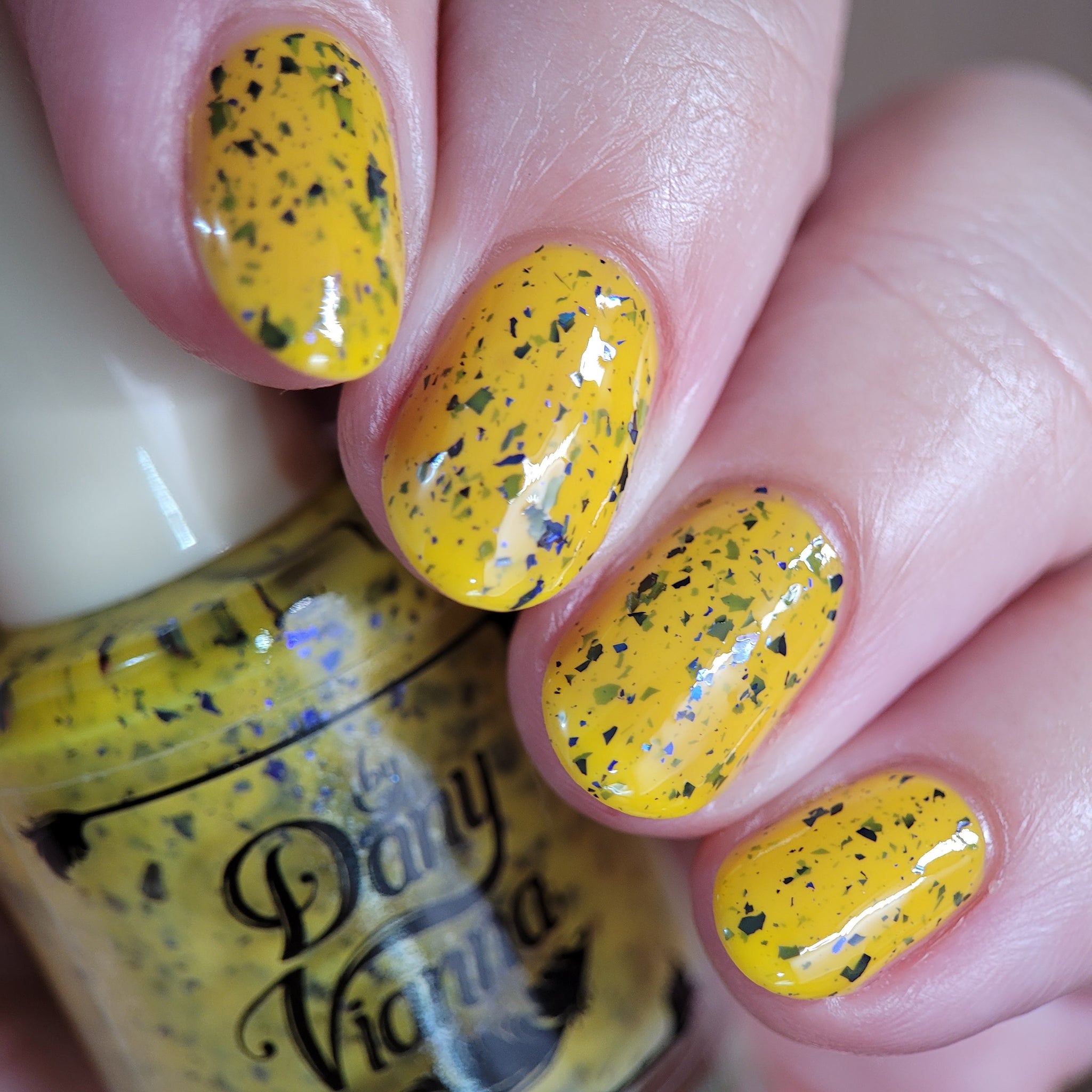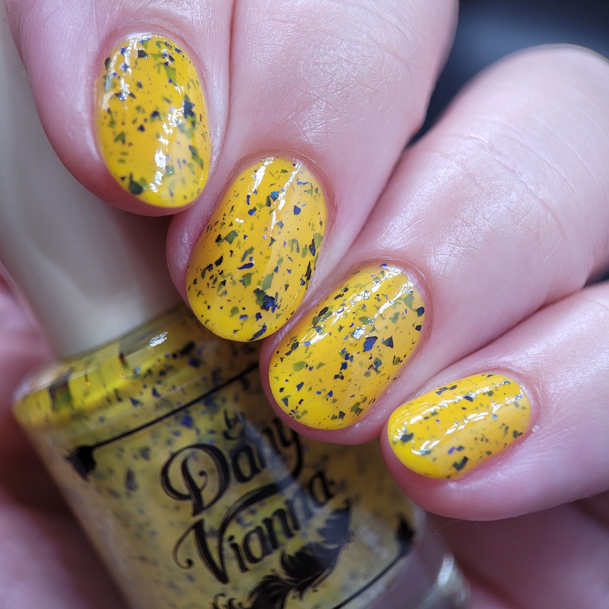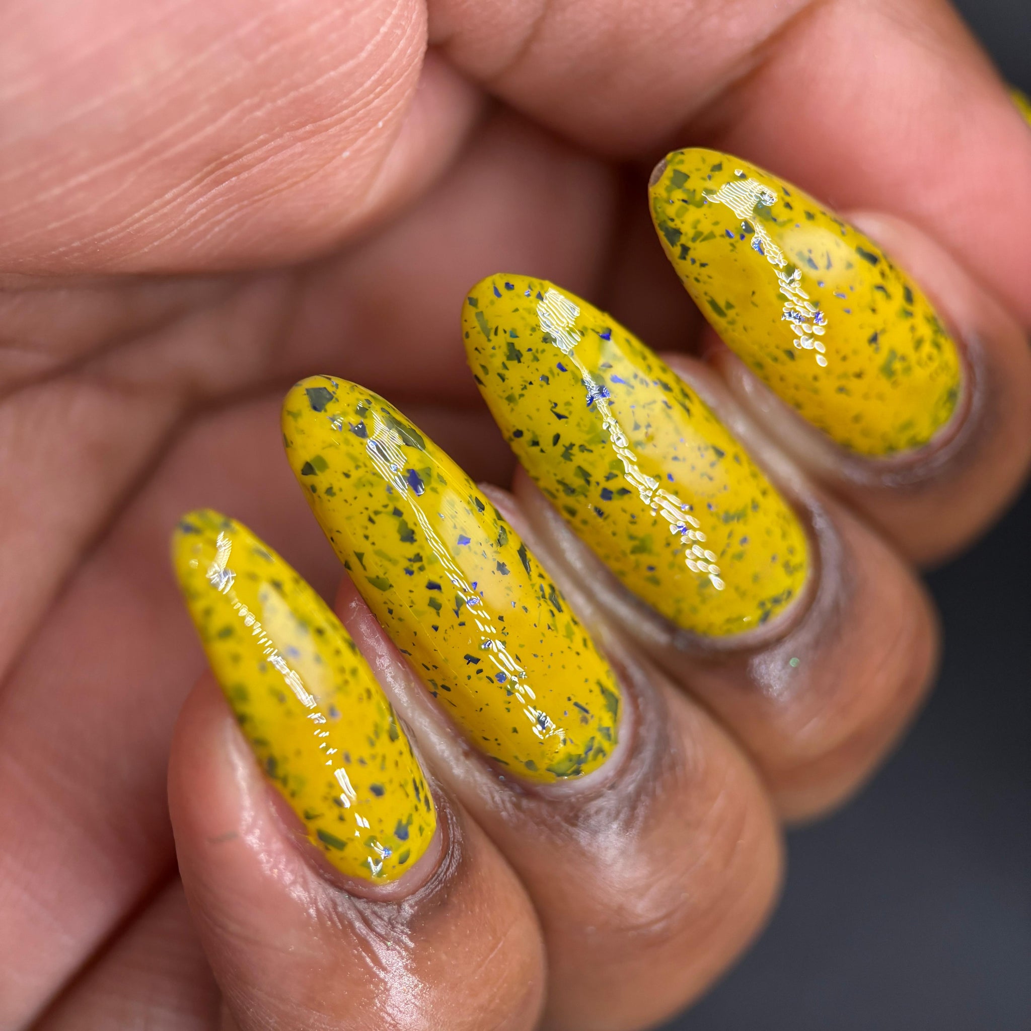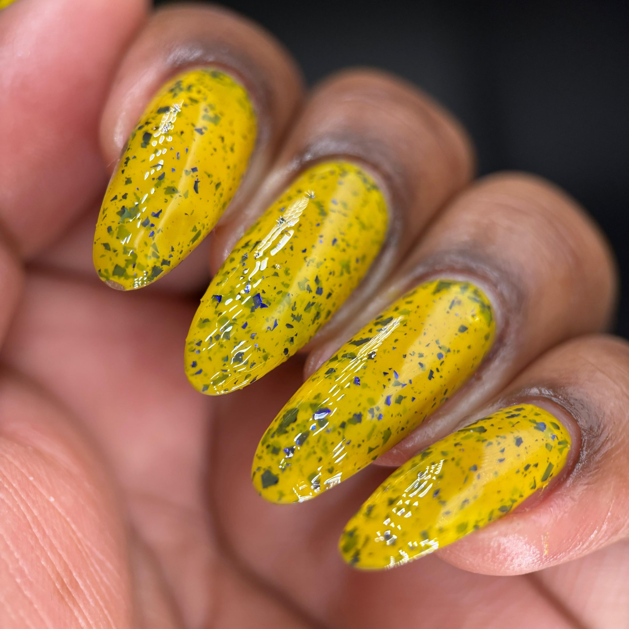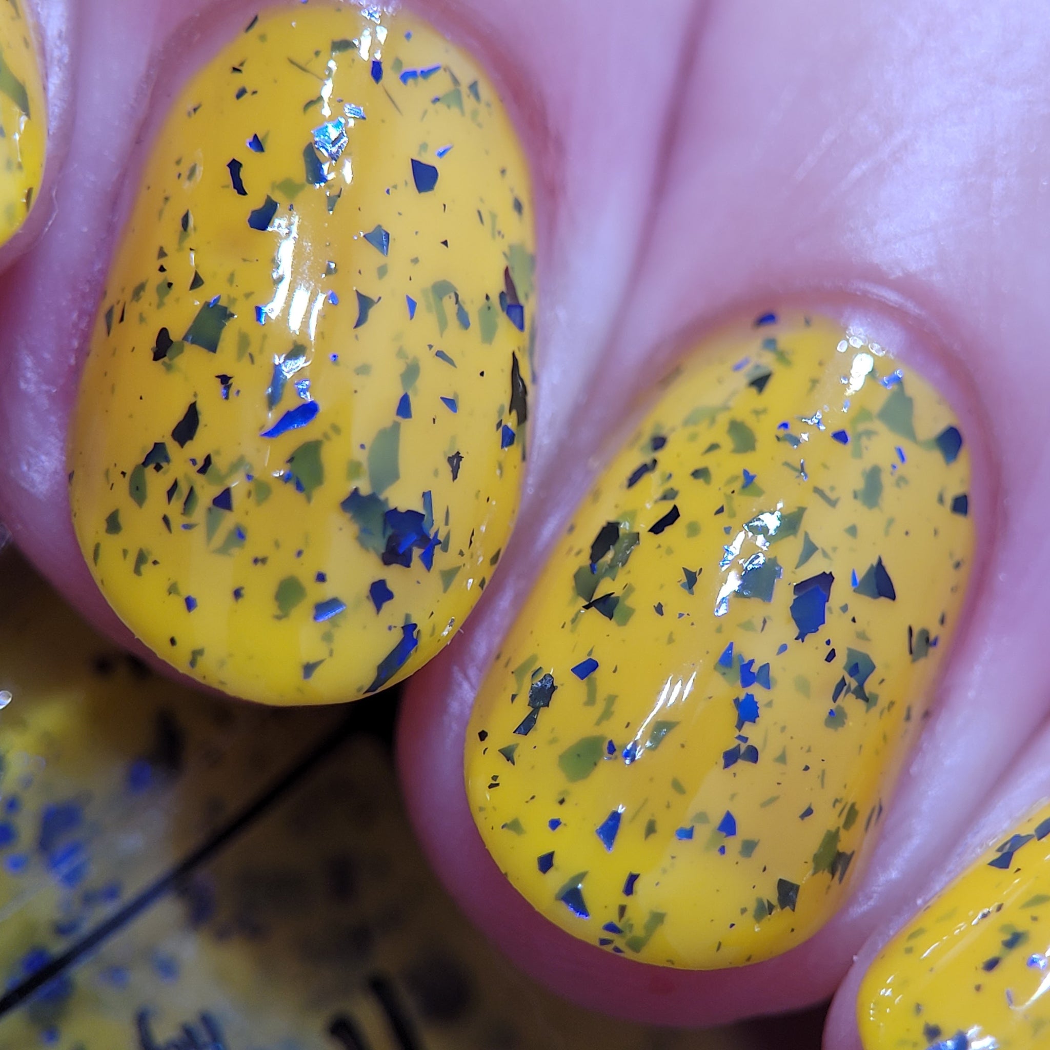 Vincent takes the Gardens has a bright yellow crelly base with a mix of indigo-purple metallic flakes and blue to black UCC flakes.