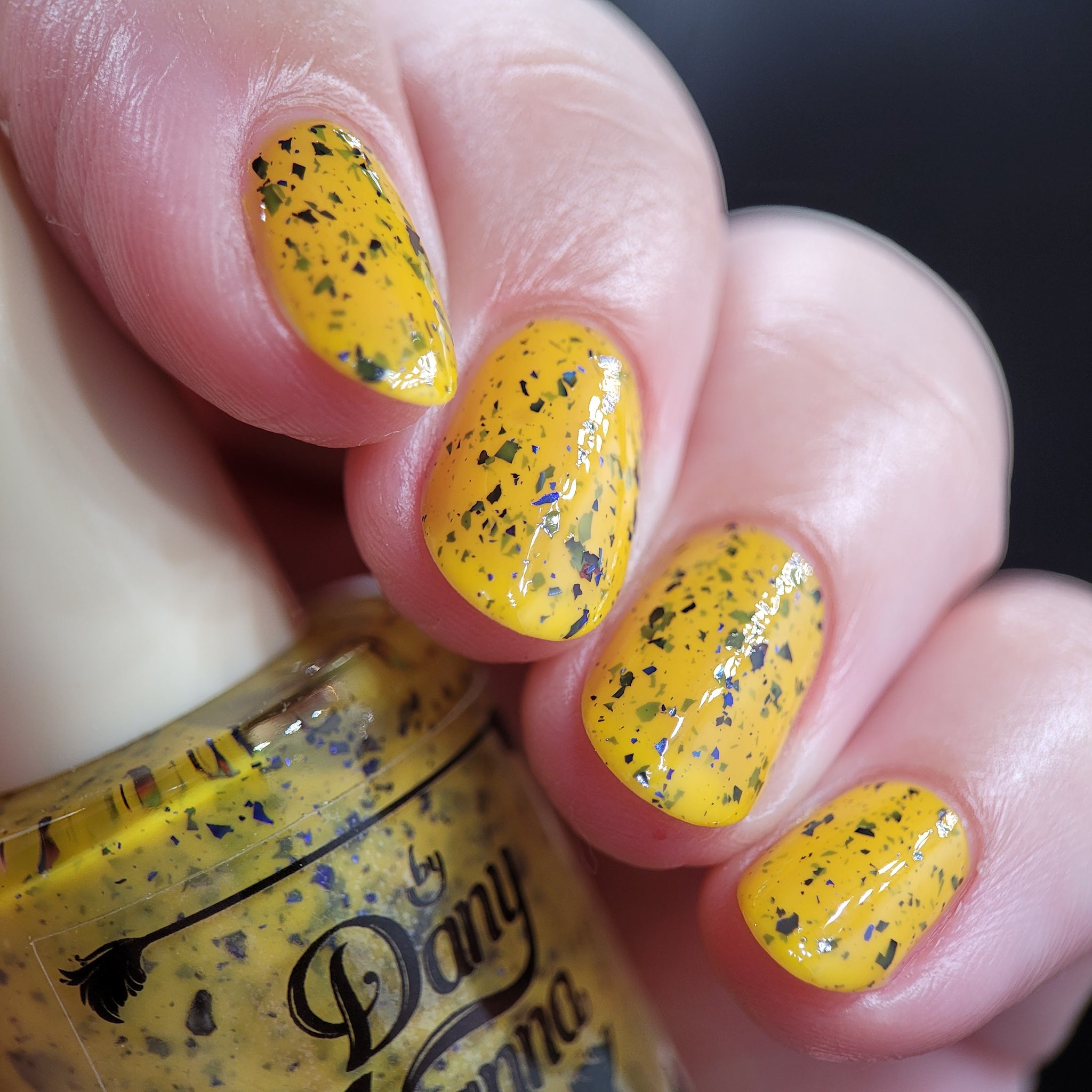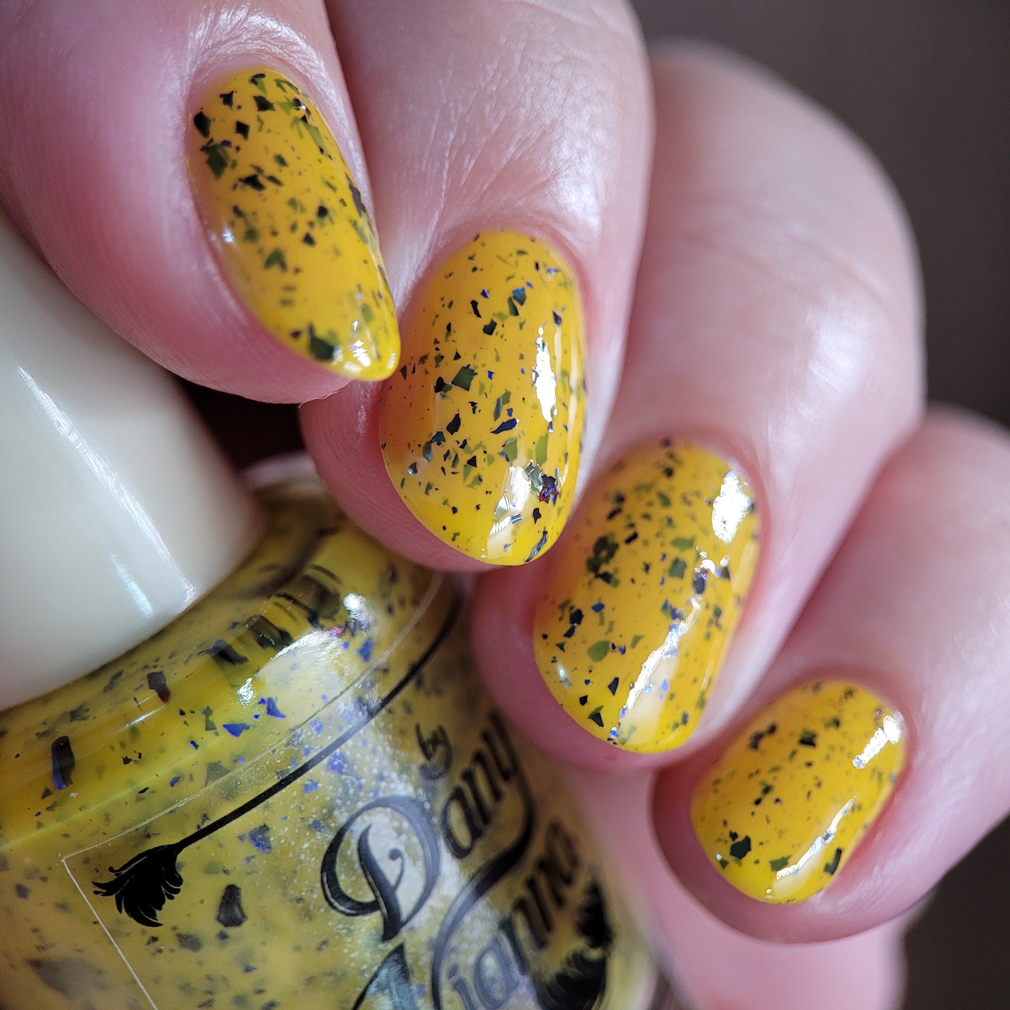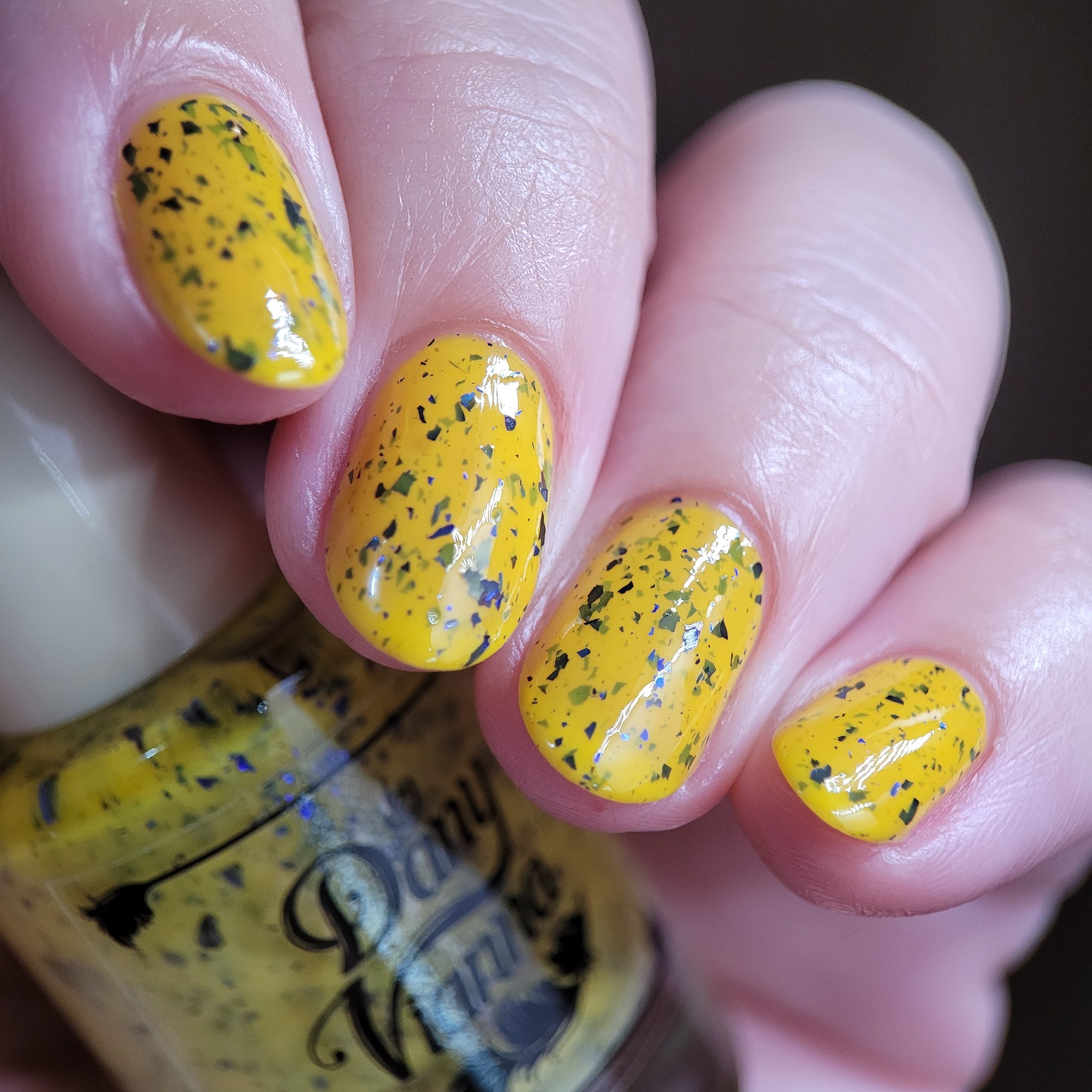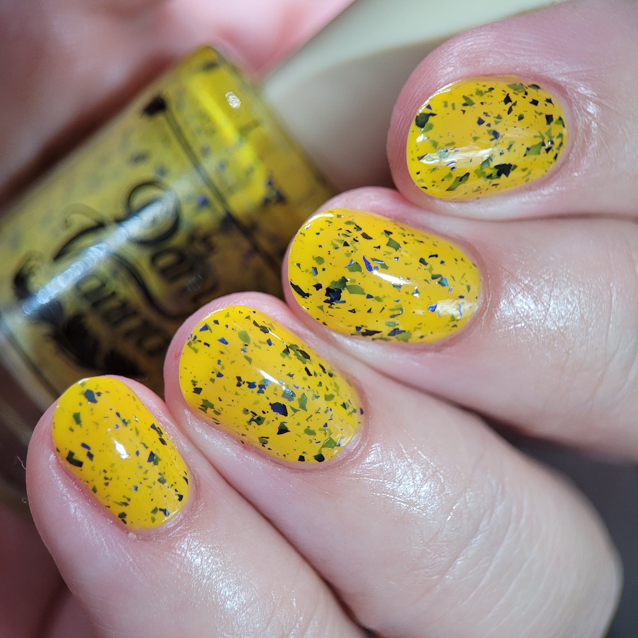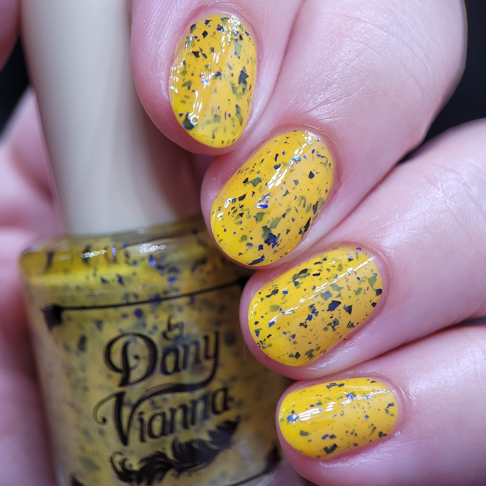 Vincent takes the Gardens has a bright yellow crelly base with a mix of indigo-purple metallic flakes and blue to black UCC flakes.
