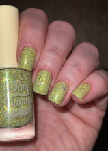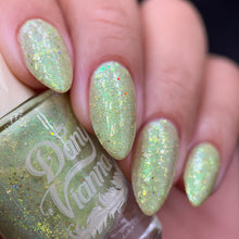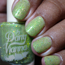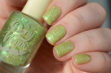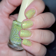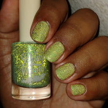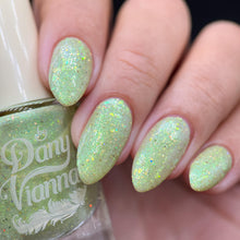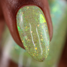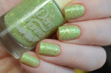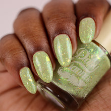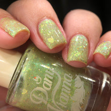 And closing our happy ending we have Princess Tiana, completely different than its original shade, we have a light crelly base with a green leaning chartreuse aurora shimmer, gold iridescent flakes, small gold holographic glitters and a lime green reflective glitter.