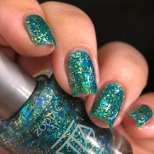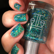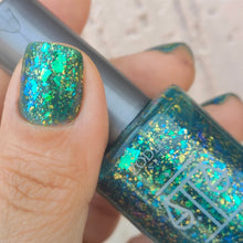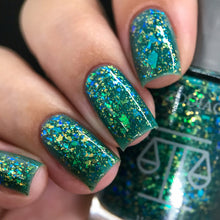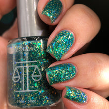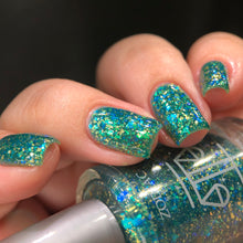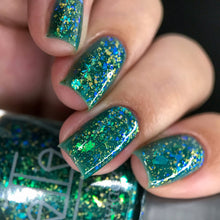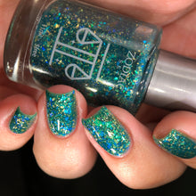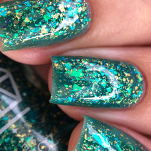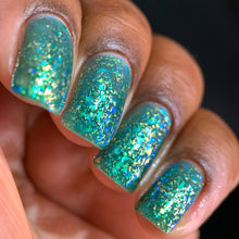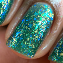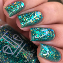 turquoise jelly base with green-blue iridescent flakes and gold metallic microflakes.