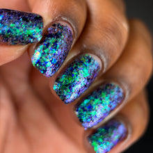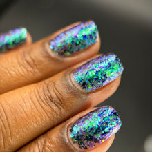 blue to black multichrome flakes with iridescent green to blue flakes and blue