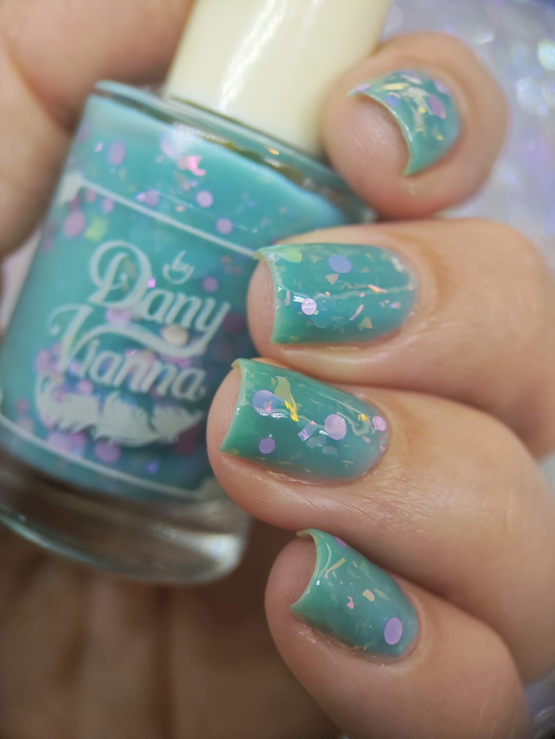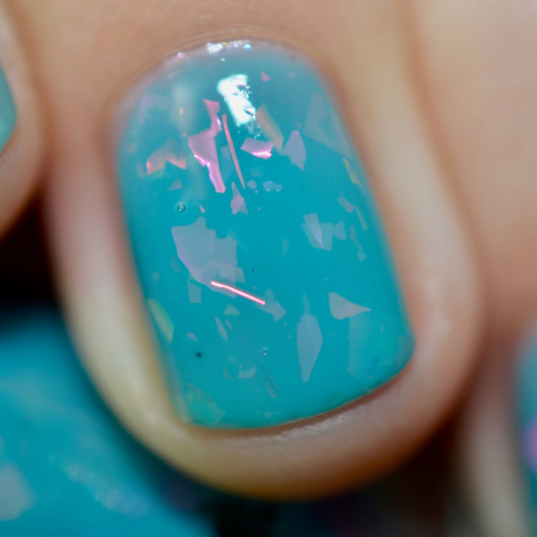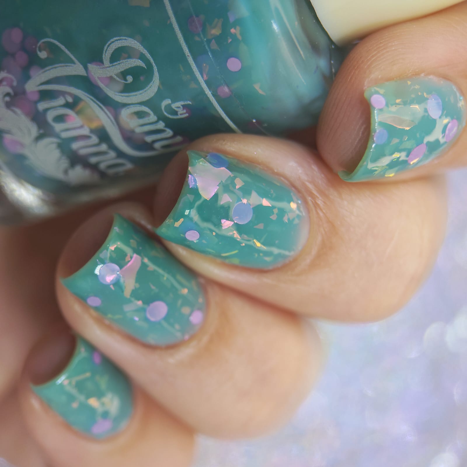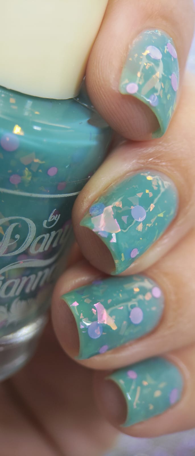 inspired by one scene released where Glinda is living her best life in the Emerald Palace, surrounded by an entourage all dressed in teal/aqua whilst she's in pale pink. Good has a teal crelly base with pink iridescent flakes and pink round glitters.