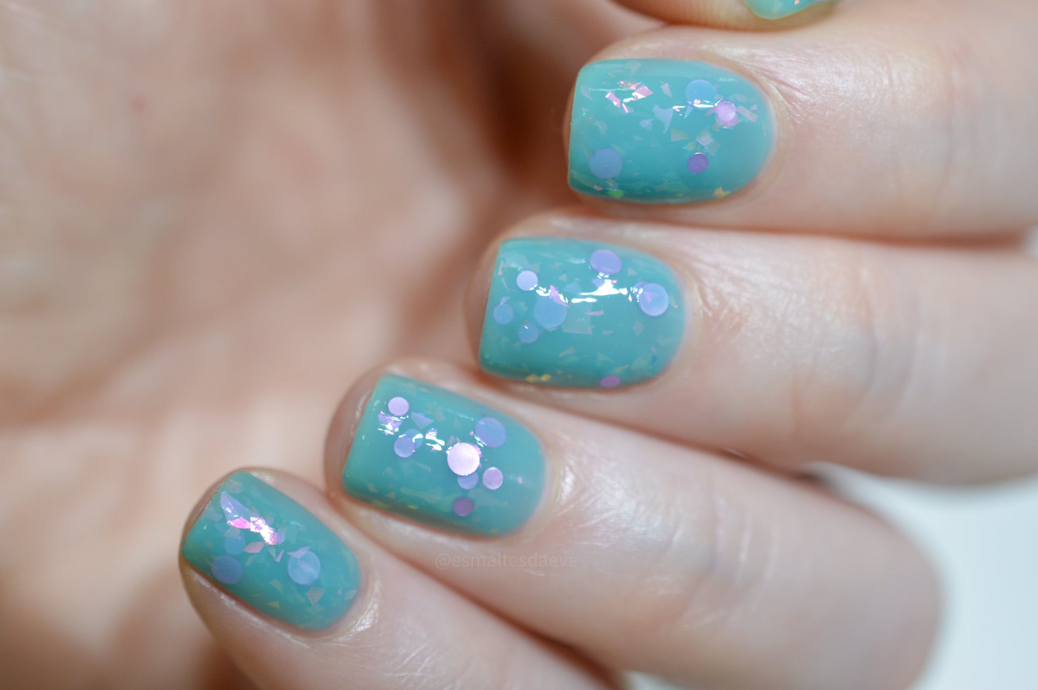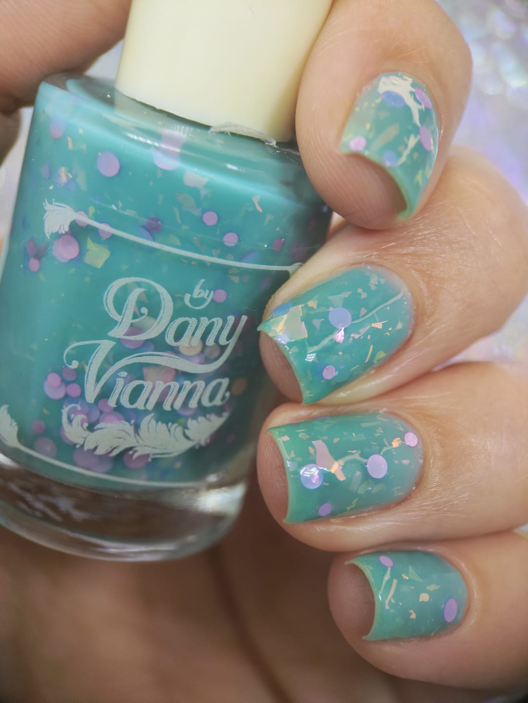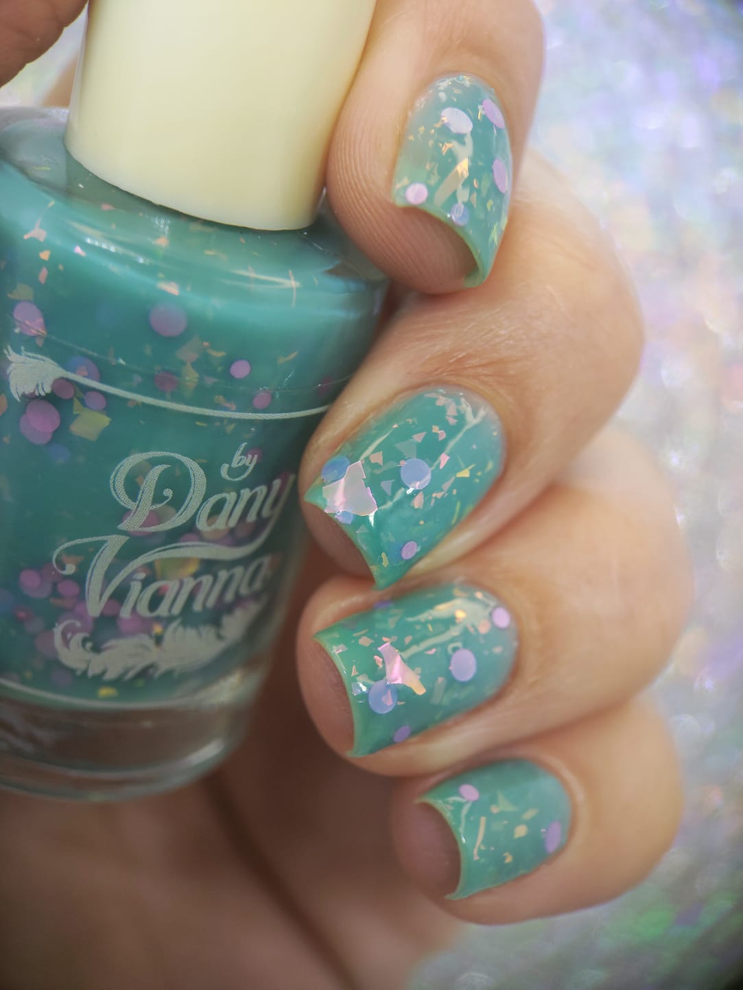 inspired by one scene released where Glinda is living her best life in the Emerald Palace, surrounded by an entourage all dressed in teal/aqua whilst she's in pale pink. Good has a teal crelly base with pink iridescent flakes and pink round glitters.