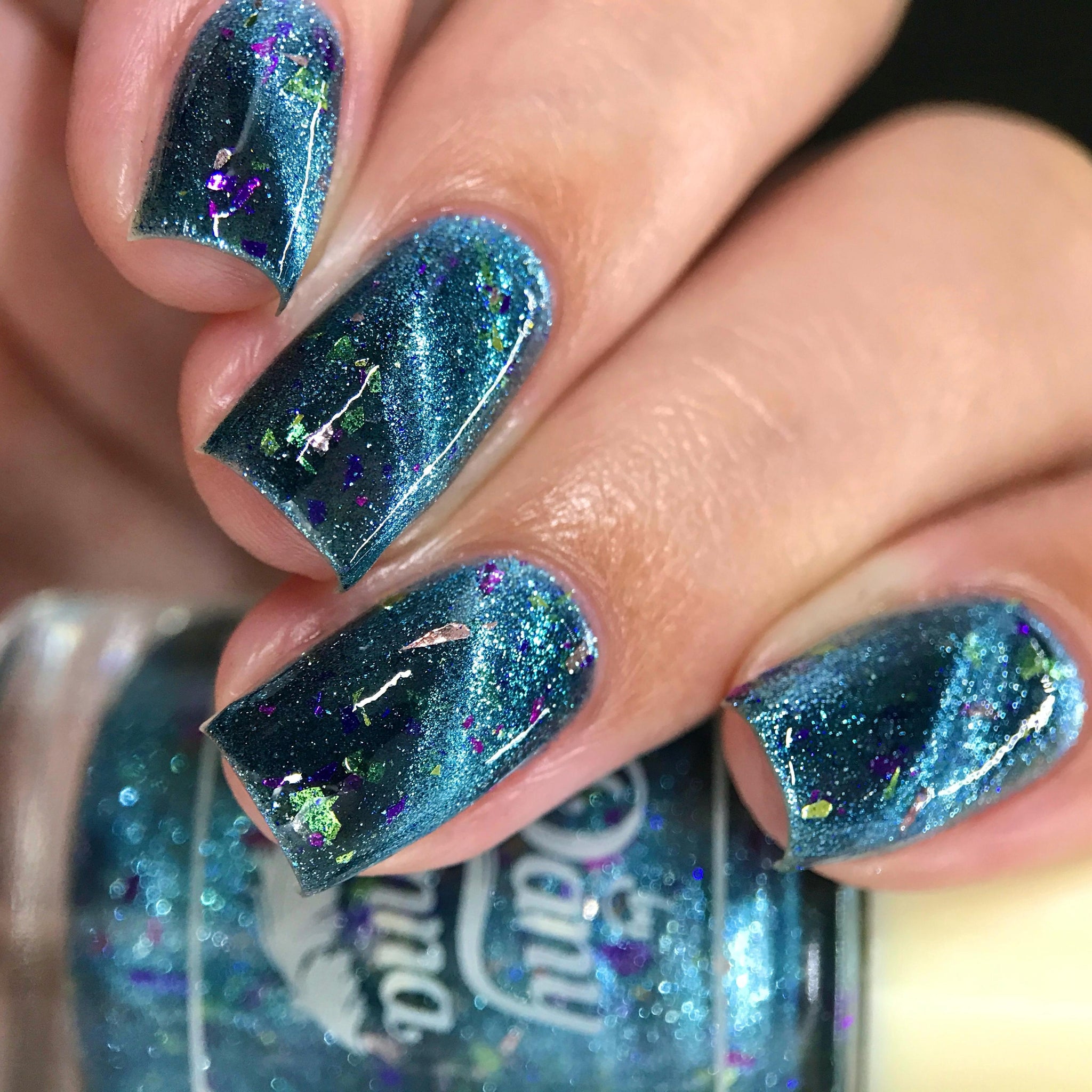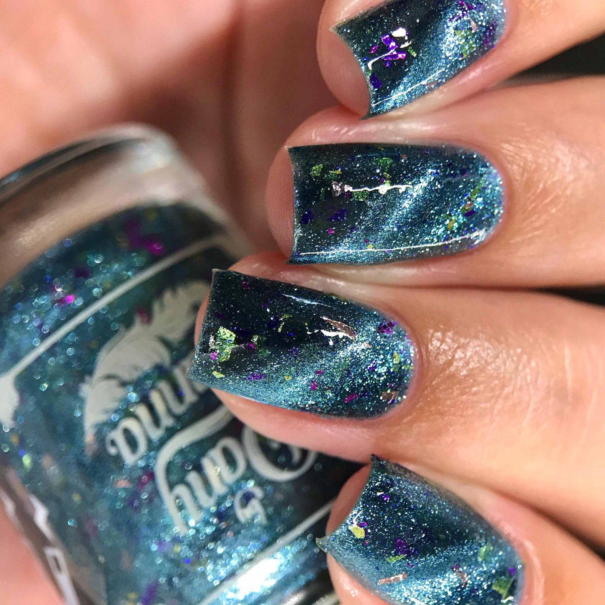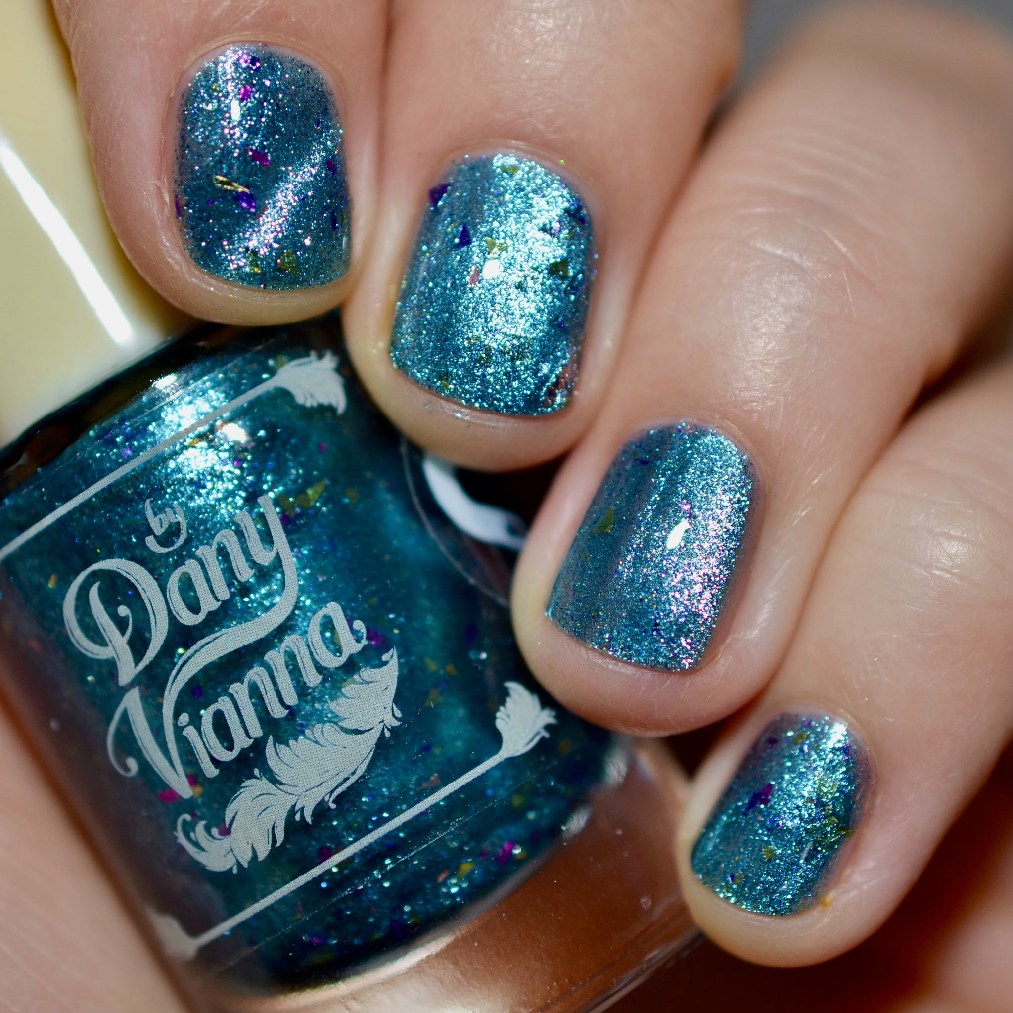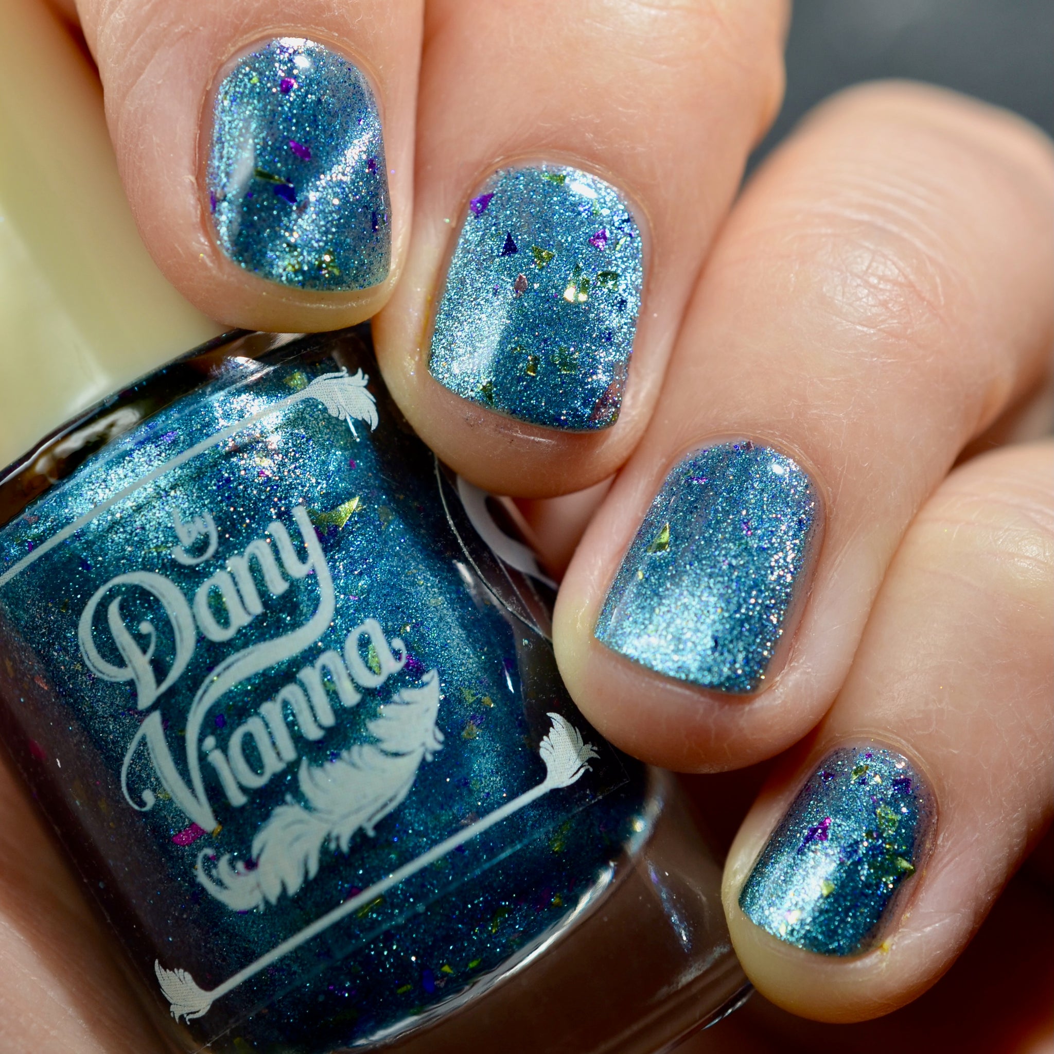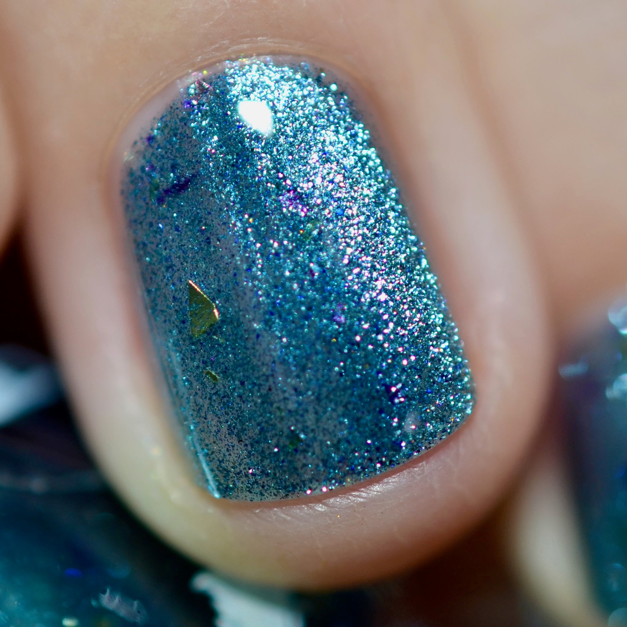 inspired by the ballroom they go to, and where Elphaba and Galinda finally meet each other as equals and not rivals. The shade is inspired by the exact moment when they arrive and we see the saloon underneath the lake at the school. We have a teal jelly base with a mix of metallic shreds and a light blue magnetic effect.