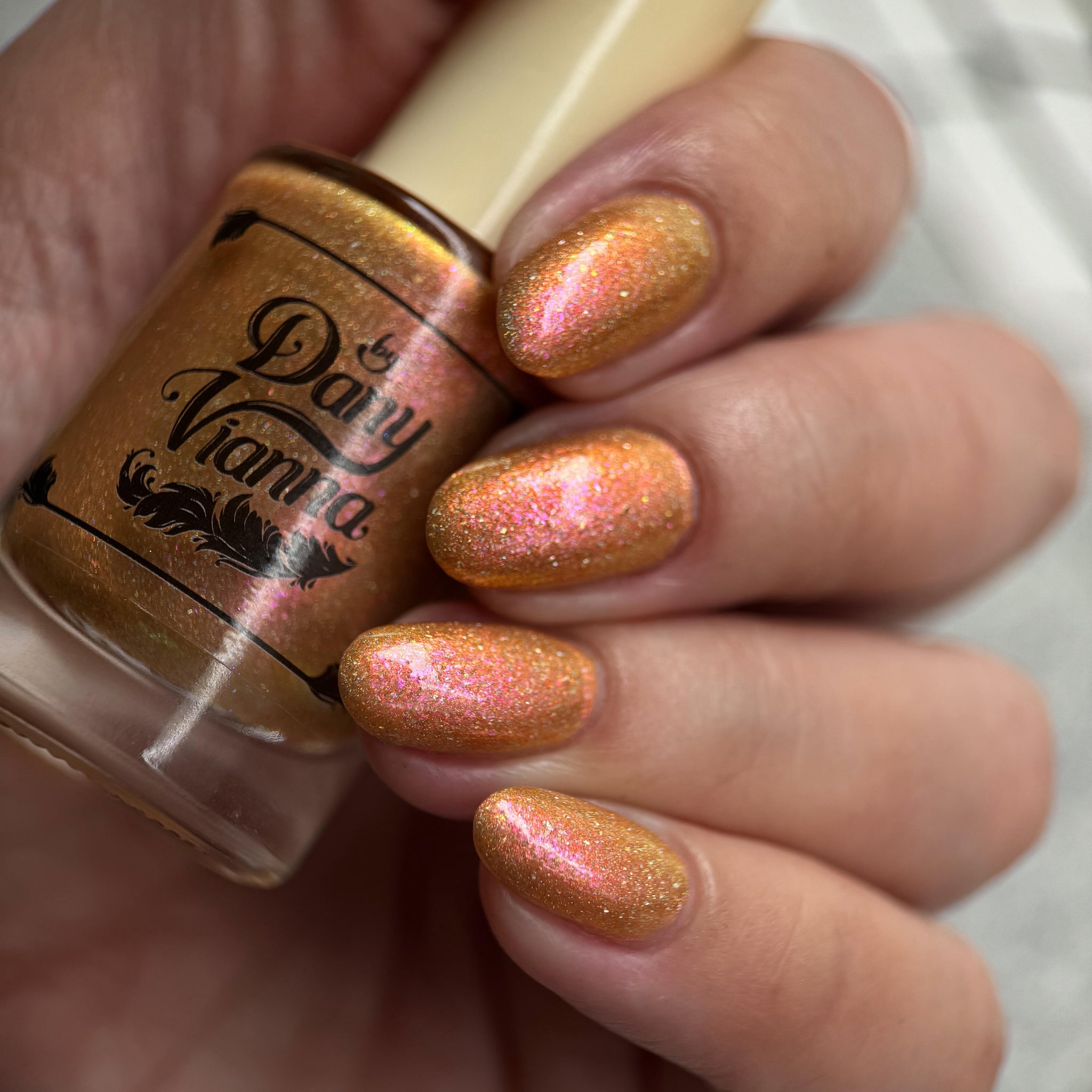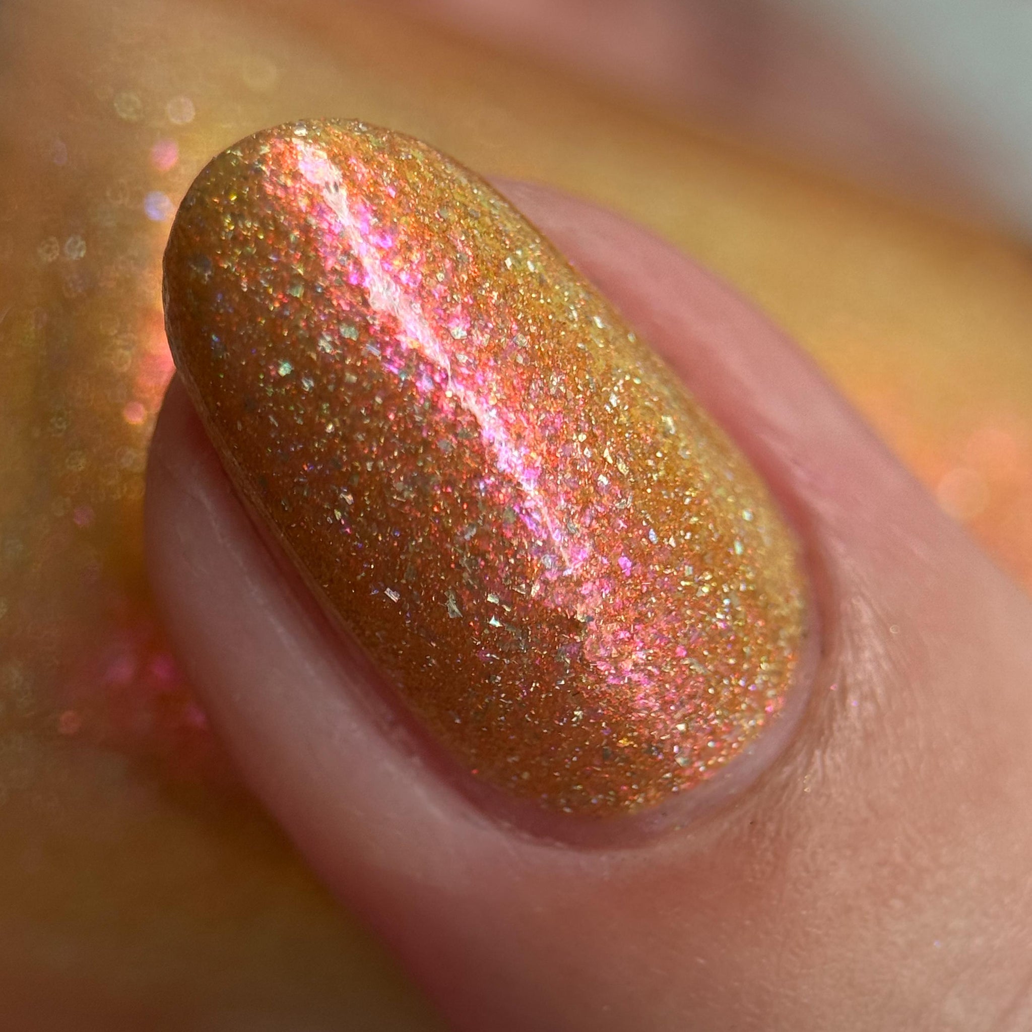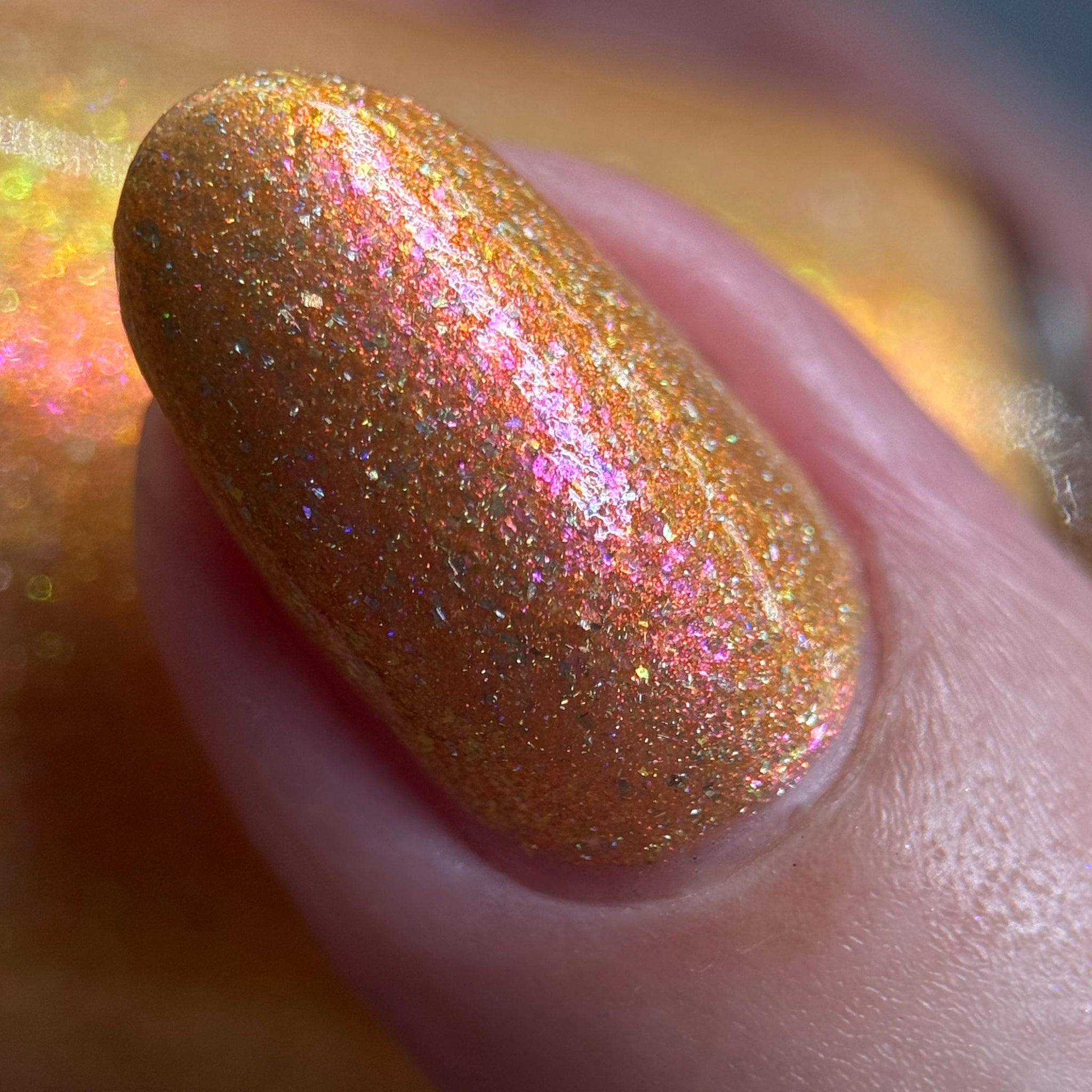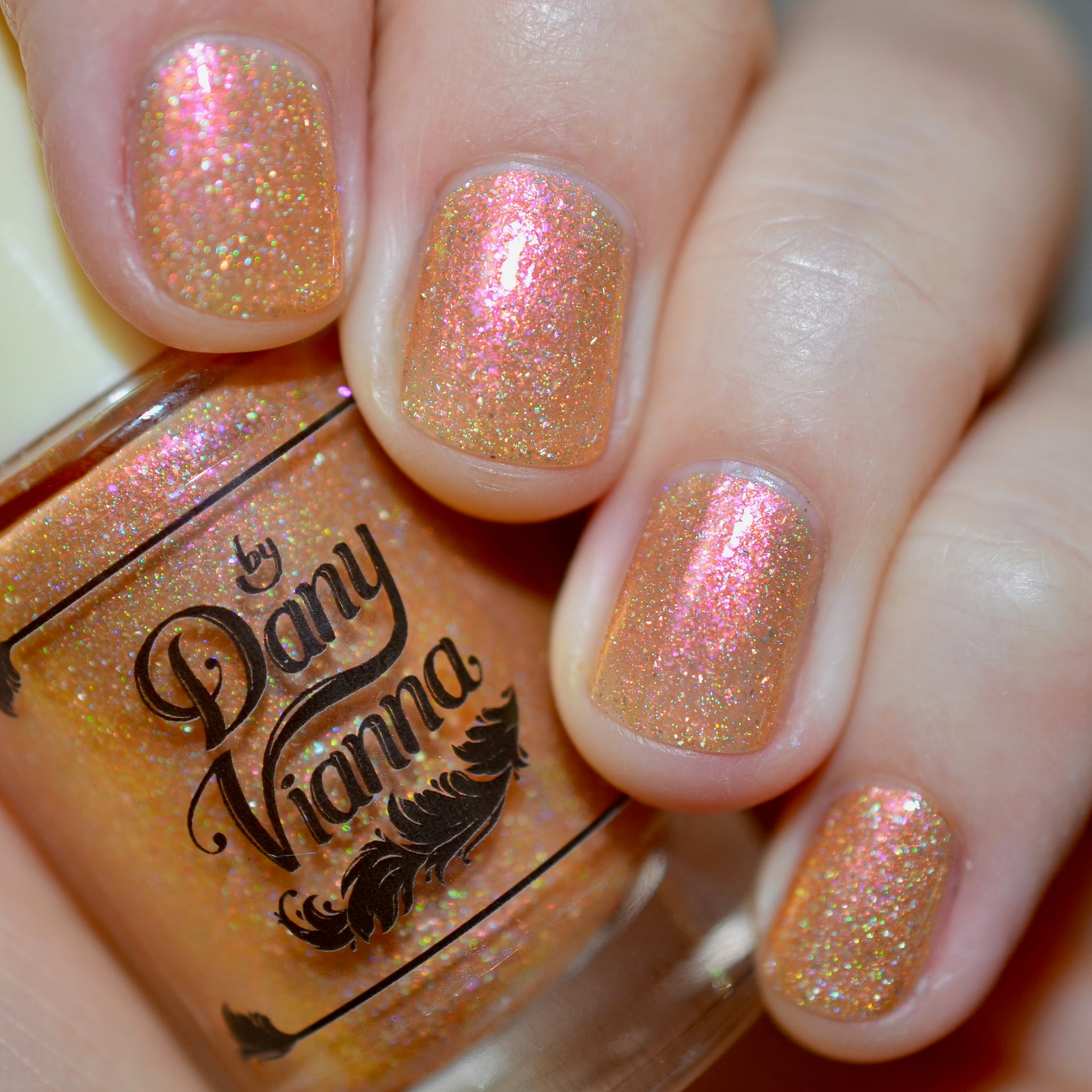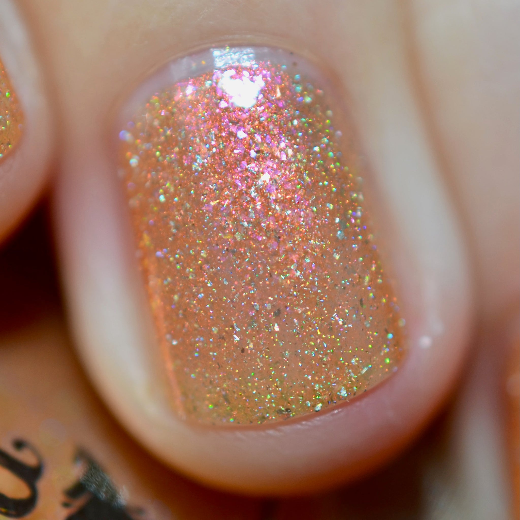 inspired by Galinda's dress to the Ozdust and we have a peachy coral crelly base with a pink aurora shimmer and holographic micro flakes